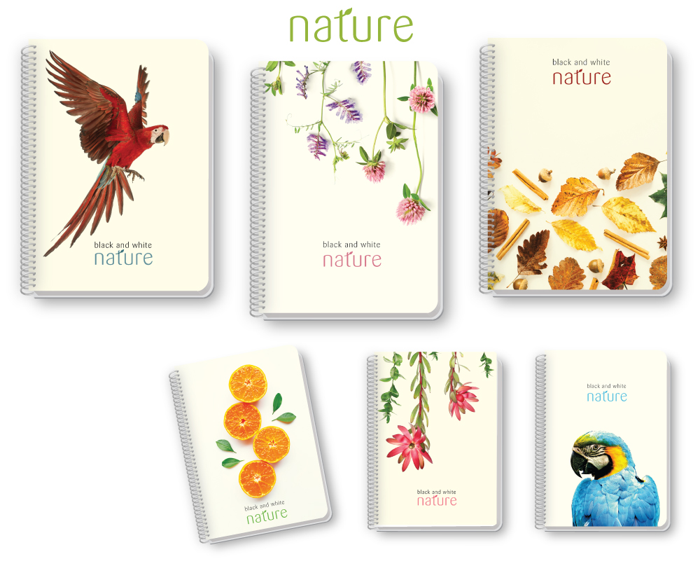 Take pieces of the nature , realistically printed on the transparent covers from our NATURE Collection . Our most-loved collection of spiral notebooks Black and White Nature.